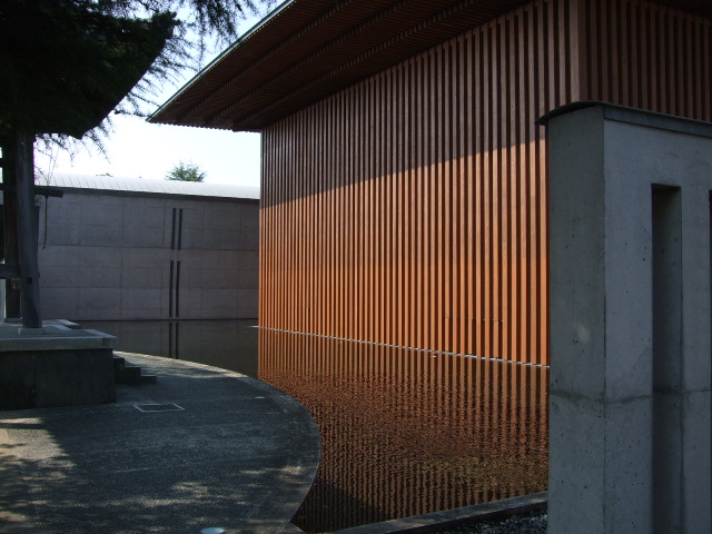 水面の奥に建つ本堂 お寺なのにコンクリート打ちっ放し感